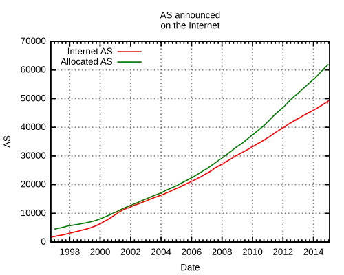 Le nombre d'AS composant Internet dépassait 5 000 en 1999, 30 000 fin 2008, 35 000 mi-2010[3], plus de 45 000 en mai 2013[4], plus de 64 000 en 2019[4]. Le nombre d'AS alloués (utilisés ou pas sur Internet) était quant à lui de plus de 91 000 en 2019[5].