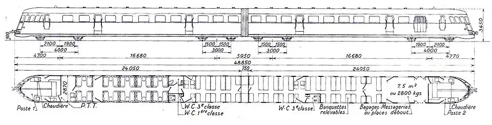 Pour les trois exemplaires d'origine, l'une des caisses comporte une cabine de conduite, un compartiment fourgon de 2 t, une salle deux compartiments de 1re/2e classe de six places chacun, une salle de 1re/2e avec 18 places en 2 + 1, une plate-forme d'accès et le WC, un bar-buffet et 12 places de 3e classe sur des banquettes. Au delà de l'intercirculation, l'autre caisse est aménagée en 3e classe en configuration 3 + 2 répartie en 3 salles, respectivement de 21, de 50 et de 19 places séparées par une deuxième plateforme d'accès où se trouvent également des toilettes puis une troisième plateforme d'accès qui comporte trois strapontins ; la caisse se termine par une cabine de conduite[6]. Dans chaque caisse, une chaudière au coke[N 1] assure, par l'intermédiaire de radiateurs à eau, le chauffage des salles voyageurs[8] ; elle prend place dans la cabine de conduite, agrandie pour la circonstance[5].