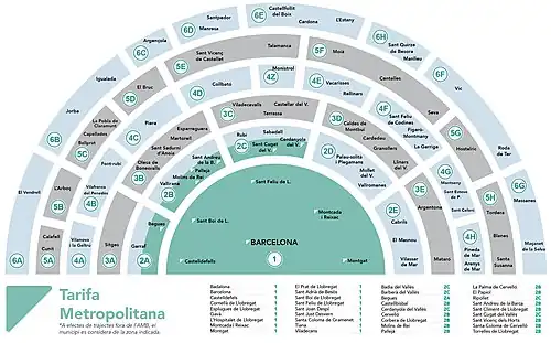 Le réseau ATM est divisé en six zones (de 1 à 6, zone centrale - plusieurs zones périphériques). Le prix du billet ne dépend pas de la région où vous voyagez, à l'exception des zones traversées pendant le voyage. La première couronne est proprement la région métropolitaine de Barcelone et inclut les municipalités de la côte de Castelldefels à Montgat.