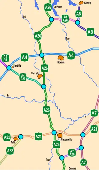 L'Autoroute A26 dite aussi Autostrada dei Trafori (autoroute des tunnels) part de Gênes, traverse la chaîne des Apennins au Passo del Turchino (532 m), puis l'agglomération d'Ovada, et rejoint l'A21 près d'Alexandrie.