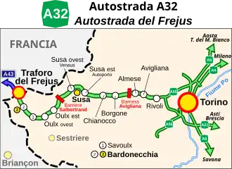 L'autoroute A32 ou autoroute du Fréjus relie Turin à Bardonnèche et à la France par le tunnel du Fréjus en Val de Suse. Son tracé total fait 72,4 km dont 19 en viaducs et 18 en tunnels.