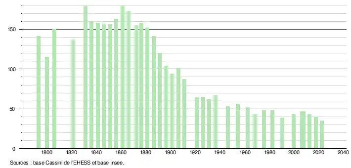 L'évolution du nombre d'habitants est connue à travers les recensements de la population effectués dans la commune depuis 1793. Pour les communes de moins de 10 000 habitants, une enquête de recensement portant sur toute la population est réalisée tous les cinq ans, les populations de référence des années intermédiaires étant quant à elles estimées par interpolation ou extrapolation[17]. Pour la commune, le premier recensement exhaustif entrant dans le cadre du nouveau dispositif a été réalisé en 2007[18].