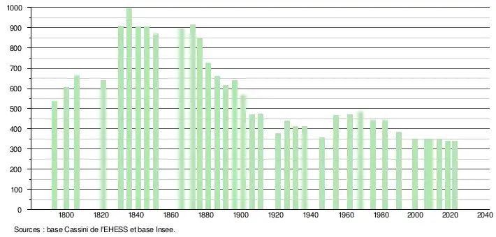 L'évolution du nombre d'habitants est connue à travers les recensements de la population effectués dans la commune depuis 1793. Pour les communes de moins de 10 000 habitants, une enquête de recensement portant sur toute la population est réalisée tous les cinq ans, les populations de référence des années intermédiaires étant quant à elles estimées par interpolation ou extrapolation[18]. Pour la commune, le premier recensement exhaustif entrant dans le cadre du nouveau dispositif a été réalisé en 2008[19].