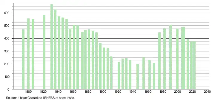 L'évolution du nombre d'habitants est connue à travers les recensements de la population effectués dans la commune depuis 1793. Pour les communes de moins de 10 000 habitants, une enquête de recensement portant sur toute la population est réalisée tous les cinq ans, les populations de référence des années intermédiaires étant quant à elles estimées par interpolation ou extrapolation[17]. Pour la commune, le premier recensement exhaustif entrant dans le cadre du nouveau dispositif a été réalisé en 2008[18].