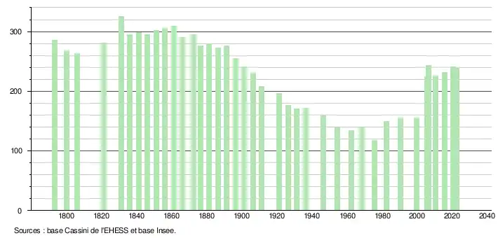 - ↑ Fiches Insee - Populations de référence de la commune pour les années 2006, 2007, 2008, 2009, 2010, 2011, 2012, 2013, 2014, 2015, 2016, 2017, 2018, 2019, 2020, 2021 et 2022.