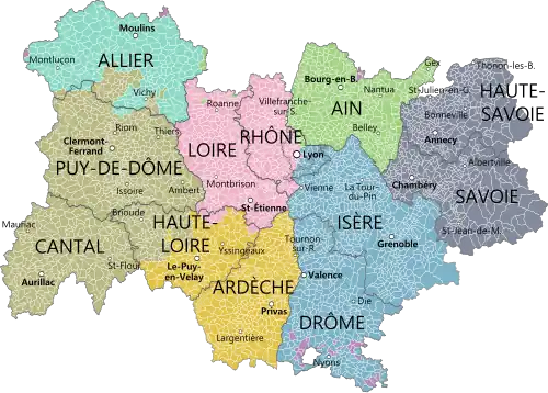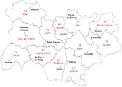 Enfin en 1960, le gouvernement Debré décide la création de circonscriptions d'action régionale[27], les régions Auvergne et Rhône-Alpes apparaissent alors dans leur forme définitive.