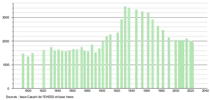 L'évolution du nombre d'habitants est connue à travers les recensements de la population effectués dans la commune depuis 1793. Pour les communes de moins de 10 000 habitants, une enquête de recensement portant sur toute la population est réalisée tous les cinq ans, les populations de référence des années intermédiaires étant quant à elles estimées par interpolation ou extrapolation[18]. Pour la commune, le premier recensement exhaustif entrant dans le cadre du nouveau dispositif a été réalisé en 2004[19].