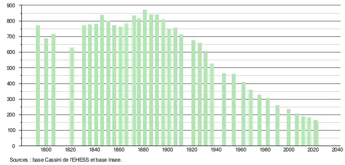 L'évolution du nombre d'habitants est connue à travers les recensements de la population effectués dans la commune depuis 1793. Pour les communes de moins de 10 000 habitants, une enquête de recensement portant sur toute la population est réalisée tous les cinq ans, les populations de référence des années intermédiaires étant quant à elles estimées par interpolation ou extrapolation[23]. Pour la commune, le premier recensement exhaustif entrant dans le cadre du nouveau dispositif a été réalisé en 2006[24].