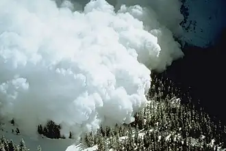 - les avalanches artificielles, déclenchées volontairement, très souvent avec une détonation aérienne (ex : à l'explosif) pour sécuriser une zone à risque en évitant les accumulations de neige trop importantes.