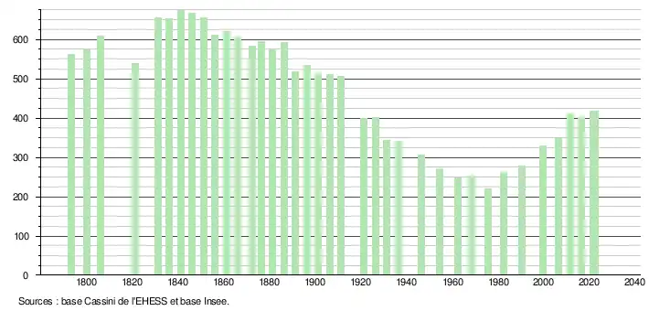 L'évolution du nombre d'habitants est connue à travers les recensements de la population effectués dans la commune depuis 1793. Pour les communes de moins de 10 000 habitants, une enquête de recensement portant sur toute la population est réalisée tous les cinq ans, les populations de référence des années intermédiaires étant quant à elles estimées par interpolation ou extrapolation[21]. Pour la commune, le premier recensement exhaustif entrant dans le cadre du nouveau dispositif a été réalisé en 2006[22].