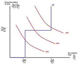Suivant les règles générales du comportement humain on considère que l’augmentation des prix décourage les consommateurs, de sorte que la courbe de demande relative sera décroissante (ici, une des courbes rouges DR).