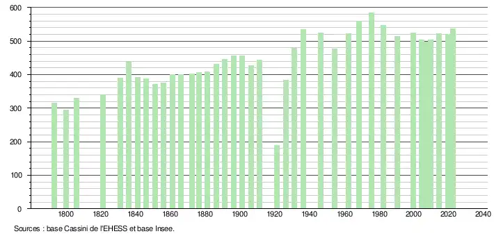 L'évolution du nombre d'habitants est connue à travers les recensements de la population effectués dans la commune depuis 1793. Pour les communes de moins de 10 000 habitants, une enquête de recensement portant sur toute la population est réalisée tous les cinq ans, les populations de référence des années intermédiaires étant quant à elles estimées par interpolation ou extrapolation[26]. Pour la commune, le premier recensement exhaustif entrant dans le cadre du nouveau dispositif a été réalisé en 2004[27].