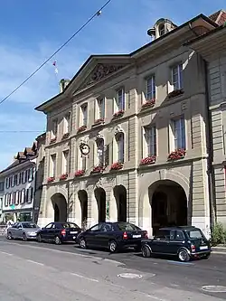L'hôtel de ville, reconstruit en 1753 par l'architecte bernois Nicolas Hebler, est un imposant édifice à arcades, avec avant-corps surmonté d'un fronton sculpté par Johann Friedrich Funk I[9].