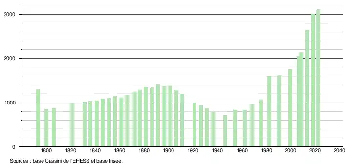 L'évolution du nombre d'habitants est connue à travers les recensements de la population effectués dans la commune depuis 1793. Pour les communes de moins de 10 000 habitants, une enquête de recensement portant sur toute la population est réalisée tous les cinq ans, les populations de référence des années intermédiaires étant quant à elles estimées par interpolation ou extrapolation[34]. Pour la commune, le premier recensement exhaustif entrant dans le cadre du nouveau dispositif a été réalisé en 2008[35].