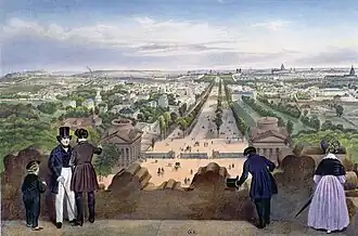 L'ingénieur Adolphe Alphand, sous Napoléon III, est à son tour chargé de l'aménagement des jardins[30]. Grâce à ses efforts, conjugués avec ceux de Hittorff, lors de l'Exposition universelle de 1855, les Champs-Élysées sont devenus le lieu à la mode. Alors que l'avenue ne comptait que six maisons en 1800[31], elle est bientôt bordée d'immeubles, d'hôtels particuliers et de maisons bourgeoises tandis que deux nouveaux lotissements se construisent au nord et au sud, à l'emplacement des anciens jardins Beaujon[32] et Marbeuf[33].