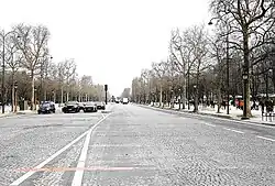 Vue de l'avenue des Champs-Élysées vers l'est, depuis le haut de l'Arc de triomphe de l'Étoile. L'obélisque de Louxor sur la place de la Concorde, le jardin des Tuileries et le palais du Louvre sont visibles dans la perspective de l'avenue.