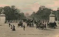 La popularité des Champs-Élysées, qui prennent alors leur dénomination définitive d’« avenue des Champs-Élysées » (1789), ne décolle véritablement que sous la Révolution française. C'est par les Champs-Élysées que passe le cortège de mégères qui, le , sous la conduite de Théroigne de Méricourt et de Reine Audu, se dirige vers Versailles pour ramener la famille royale à Paris[15]. C'est aussi par les Champs-Élysées que la famille royale est ramenée dans Paris le après la fuite à Varennes, entre deux haies de Gardes nationaux qui rendent les honneurs la crosse en l'air. Sous la Terreur, la place de la Concorde est le théâtre des exécutions capitales. Au bas de l'avenue, Huzard fait placer, sur des socles dessinés par le peintre David, les groupes de chevaux en marbre exécutés par Guillaume Coustou pour l'abreuvoir du château de Marly. Sur le plan administratif, la section des Champs-Élysées est créée en 1790, circonscription qui devient en 1795 le quartier des Champs-Élysées. Le territoire du quartier administratif des Champs-Élysées s'étend alors au nord et au sud de l'avenue du même nom. Après le redécoupage de 1860, le quartier de ce nom sera d'une surface plus restreinte et essentiellement au sud de l'avenue.