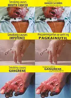Les avertissements sur les paquets de cigarettes sont des messages écrits (parfois aussi illustrés) sur les paquets de cigarettes et de tabac visant à informer les consommateurs des risques qu'ils prennent en consommant cette substance. En effet, le tabac peut avoir des effets graves sur la santé. La Convention-cadre de l'OMS pour la lutte antitabac recommande ces avertissements[1]. Les avertissements varient en teneur et en taille suivant les pays.