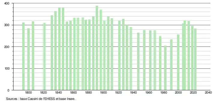L'évolution du nombre d'habitants est connue à travers les recensements de la population effectués dans la commune depuis 1793. Pour les communes de moins de 10 000 habitants, une enquête de recensement portant sur toute la population est réalisée tous les cinq ans, les populations de référence des années intermédiaires étant quant à elles estimées par interpolation ou extrapolation[22]. Pour la commune, le premier recensement exhaustif entrant dans le cadre du nouveau dispositif a été réalisé en 2008[23].