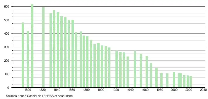 L'évolution du nombre d'habitants est connue à travers les recensements de la population effectués dans la commune depuis 1793. Pour les communes de moins de 10 000 habitants, une enquête de recensement portant sur toute la population est réalisée tous les cinq ans, les populations de référence des années intermédiaires étant quant à elles estimées par interpolation ou extrapolation[22]. Pour la commune, le premier recensement exhaustif entrant dans le cadre du nouveau dispositif a été réalisé en 2008[23].