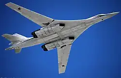 Un Tupolev Tu-160, le dernier bombardier stratégique conçu en Union soviétique et qui, dans les années 2020, reste le plus récent de l'aviation russe.