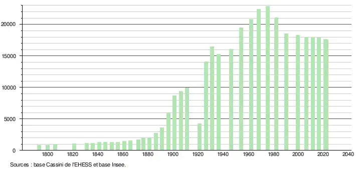 - ↑ Par convention dans Wikipédia, le principe a été retenu de n’afficher dans le tableau des recensements et le graphique, pour les populations de référence postérieures à 1999, que les populations correspondant à une enquête exhaustive de recensement pour les communes de moins de 10 000 habitants, et que les populations des années 2006, 2011, 2016, etc. pour les communes de plus de 10 000 habitants, ainsi que la dernière population de référence publiée par l’Insee pour l'ensemble des communes.