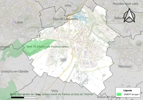 Le territoire communal comprend une ZNIEFF de type 1[Note 2] : le terril 75 d'Avion (de Pinchonvalles) qui, avec 140 ha, est le deuxième terril d'Europe pour la surface occupée[13].
