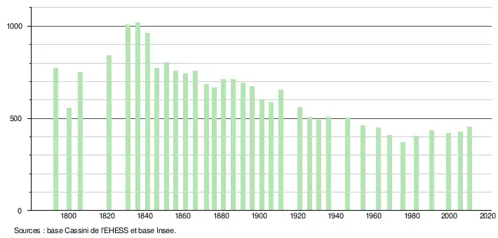 L'évolution du nombre d'habitants est connue à travers les recensements de la population effectués dans la commune depuis 1793. À partir du , les populations légales des communes sont publiées annuellement dans le cadre d'un recensement qui repose désormais sur une collecte d'information annuelle, concernant successivement tous les territoires communaux au cours d'une période de cinq ans. Pour les communes de moins de 10 000 habitants, une enquête de recensement portant sur toute la population est réalisée tous les cinq ans, les populations légales des années intermédiaires étant quant à elles estimées par interpolation ou extrapolation[11]. Pour la commune, le premier recensement exhaustif entrant dans le cadre du nouveau dispositif a été réalisé en 2005[12],[Note 1].