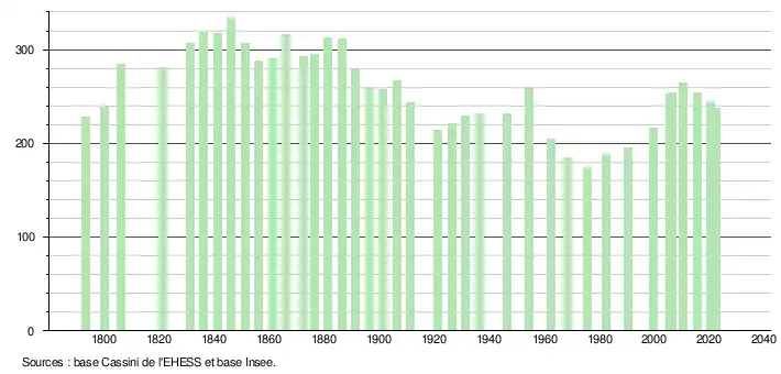 L'évolution du nombre d'habitants est connue à travers les recensements de la population effectués dans la commune depuis 1793. Pour les communes de moins de 10 000 habitants, une enquête de recensement portant sur toute la population est réalisée tous les cinq ans, les populations de référence des années intermédiaires étant quant à elles estimées par interpolation ou extrapolation[29]. Pour la commune, le premier recensement exhaustif entrant dans le cadre du nouveau dispositif a été réalisé en 2005[30].