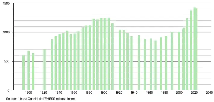L'évolution du nombre d'habitants est connue à travers les recensements de la population effectués dans la commune depuis 1793. Pour les communes de moins de 10 000 habitants, une enquête de recensement portant sur toute la population est réalisée tous les cinq ans, les populations de référence des années intermédiaires étant quant à elles estimées par interpolation ou extrapolation[26]. Pour la commune, le premier recensement exhaustif entrant dans le cadre du nouveau dispositif a été réalisé en 2005[27].