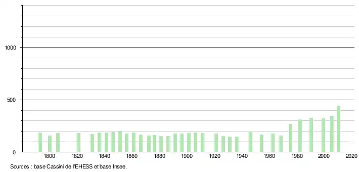 L'évolution du nombre d'habitants est connue à travers les recensements de la population effectués dans la commune depuis 1793. À partir du , les populations légales des communes sont publiées annuellement dans le cadre d'un recensement qui repose désormais sur une collecte d'information annuelle, concernant successivement tous les territoires communaux au cours d'une période de cinq ans. Pour les communes de moins de 10 000 habitants, une enquête de recensement portant sur toute la population est réalisée tous les cinq ans, les populations légales des années intermédiaires étant quant à elles estimées par interpolation ou extrapolation[15]. Pour la commune, le premier recensement exhaustif entrant dans le cadre du nouveau dispositif a été réalisé en 2005[16],[Note 1].