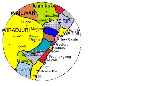 Selon Norman Tindale, au moment de l'arrivée ses Européens, les Awabakal étaient entourés par les Worimi au nord-est, les Wonnarua au nord-ouest et les Darkinjang à l'ouest et au sud.