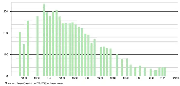 L'évolution du nombre d'habitants est connue à travers les recensements de la population effectués dans la commune depuis 1793. Pour les communes de moins de 10 000 habitants, une enquête de recensement portant sur toute la population est réalisée tous les cinq ans, les populations de référence des années intermédiaires étant quant à elles estimées par interpolation ou extrapolation[39]. Pour la commune, le premier recensement exhaustif entrant dans le cadre du nouveau dispositif a été réalisé en 2008[40].