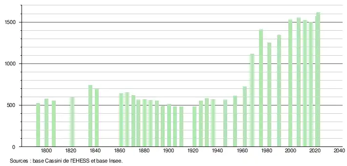 L'évolution du nombre d'habitants est connue à travers les recensements de la population effectués dans la commune depuis 1793. Pour les communes de moins de 10 000 habitants, une enquête de recensement portant sur toute la population est réalisée tous les cinq ans, les populations de référence des années intermédiaires étant quant à elles estimées par interpolation ou extrapolation[19]. Pour la commune, le premier recensement exhaustif entrant dans le cadre du nouveau dispositif a été réalisé en 2006[20].