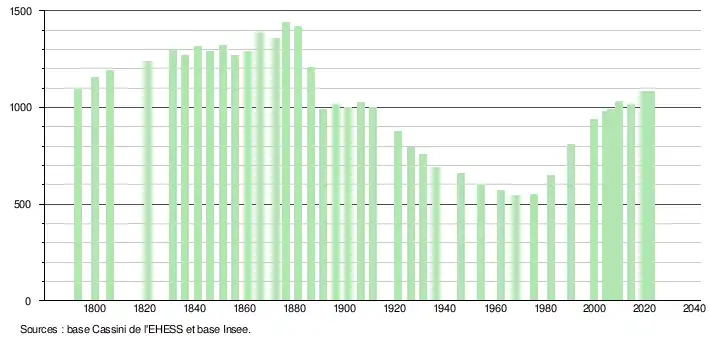 L'évolution du nombre d'habitants est connue à travers les recensements de la population effectués dans la commune depuis 1793. Pour les communes de moins de 10 000 habitants, une enquête de recensement portant sur toute la population est réalisée tous les cinq ans, les populations de référence des années intermédiaires étant quant à elles estimées par interpolation ou extrapolation[23]. Pour la commune, le premier recensement exhaustif entrant dans le cadre du nouveau dispositif a été réalisé en 2004[24].