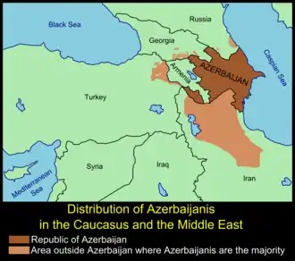L’azerbaïdjanais, la langue officielle de la République d’Azerbaïdjan, est parlée aujourd’hui par plus de 90,6 % de sa population. Il est également parlé par plus de 10 millions de personnes en Iran (16 % de la population environ)[25] dans les régions de l’Azerbaïdjan iranien et dans toutes les grandes villes d'Iran), en Géorgie à cause d’une présence historique, en Turquie et en Russie avec l’immigration. Parfois on parle de l’azéri ou encore de l’azéri-turc. L’azerbaïdjanais est une définition géopolitique et l’azéri-turc est ethnolinguistique.