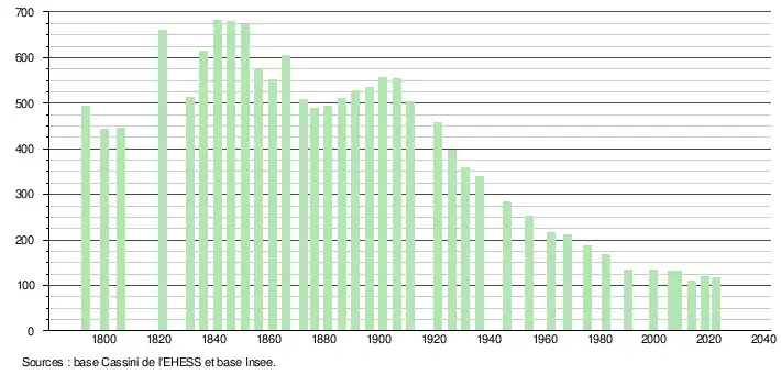 L'évolution du nombre d'habitants est connue à travers les recensements de la population effectués dans la commune depuis 1793. Pour les communes de moins de 10 000 habitants, une enquête de recensement portant sur toute la population est réalisée tous les cinq ans, les populations de référence des années intermédiaires étant quant à elles estimées par interpolation ou extrapolation[19]. Pour la commune, le premier recensement exhaustif entrant dans le cadre du nouveau dispositif a été réalisé en 2008[20].
