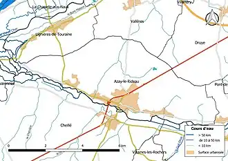 L'Indre, d'une longueur totale de 279,4 km, prend sa source à une altitude de 453 m sur le territoire de Saint-Priest-la-Marche dans le département du Cher et se jette dans la Loire à Avoine, après avoir traversé 58 communes[3]. Les crues de l'Indre sont le plus souvent de type inondation de plaine[Note 1]. Sur le plan de la prévision des crues, la commune est située dans le tronçon de l'Indre tourangelle[5], dont la station hydrométrique de référence la plus proche est située à Monts. Le débit mensuel moyen (calculé sur 14 ans pour cette station) varie de 4,51 m3/s au mois de septembre à 34 m3/s au mois de février. Le débit instantané maximal observé sur cette station est de 236 m3/s le , la hauteur maximale relevée a été de 5,56 m ce même jour[6],[7].