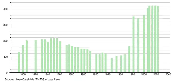 L'évolution du nombre d'habitants est connue à travers les recensements de la population effectués dans la commune depuis 1793. Pour les communes de moins de 10 000 habitants, une enquête de recensement portant sur toute la population est réalisée tous les cinq ans, les populations de référence des années intermédiaires étant quant à elles estimées par interpolation ou extrapolation[24]. Pour la commune, le premier recensement exhaustif entrant dans le cadre du nouveau dispositif a été réalisé en 2008[25].
