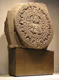Selon la tradition aztèque rapportée notamment dans les codex, en l'année 2-maison (1325), sur une petite île marécageuse au milieu du lac Texcoco, les futurs Mexicas auraient vu un aigle perché sur un cactus ; selon les sources, cet aigle tenait dans ses serres une figue de barbarie (tenochtli en nahuatl)[25] ou un serpent[26],[24], bien que cette dernière hypothèse soit probablement une interprétation peu pertinente, à l'époque coloniale, du glyphe « atl-tlachninolli » (représentant un double courant d'eau et de feu symbolisant la guerre), qui sort du bec de l'oiseau sur la seule pièce archéologique représentant cette scène[27]. Cette erreur d'interprétation a peut-être été volontairement diffusée par les Espagnols pour occulter toute référence aux sacrifices humains (la figue de barbarie symbolisant en effet le cœur des sacrifiés)[28].