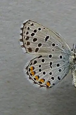 Le revers est beige très peu suffusé de bleu et orné de lignes de petits points noirs. L'aile postérieure présente de plus une ligne submarginale de points orange[2].