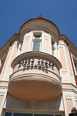 La décoration plastique est caractéristique du style Sécession, auquel se mêlent des éléments néo-Renaissance[3]. Le toit est recouvert de tuiles et surmonté d'une structure décorative en fer forgé[3].