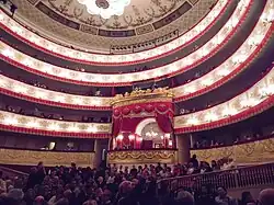 La décoration de la salle est solennelle et élégante, l'intérieur a pratiquement gardé sa décoration d'origine. Au début, les fauteuils étaient recouverts de tissus bleus et c'est en 1849 que la décoration est passée au rouge vif. Le théâtre était alors éclairé par des lampes à huile qui noircissaient la décoration intérieure. C'est pourquoi, avec le temps, il a fallu repeindre tous les murs et les plafonds. La scène a également été entièrement restaurée. En plus de garnitures en velours, des loges sont garnies de sculptures dorées : la loge centrale (impériale) et la loge près de la scène sont garnies de dessins de Carlo Rossi, mais les ornements des balustrades des galeries ont été ajoutés dans la seconde partie du XIXe siècle.