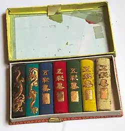 Les bâtons d'encre pour l'écriture sont noirs, tandis que pour la peinture, il est également courant de trouver des bâtons d'encre de différentes couleurs, également utilisés depuis plusieurs siècles dans la peinture chinoise et celles des pays les ayant adoptés.