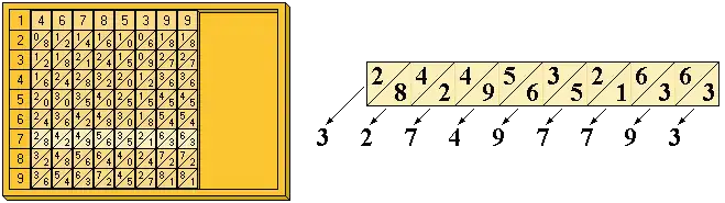 Pour faciliter encore la lecture, les gravures délimitant les cases sont rendues bien visibles, plus que les bords des bâtons. Les produits partiels apparaissent alors très clairement, avec par exemple, sur la figure ci-contre
