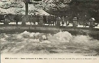 Selon le géographe François Robert, en 1789, la résurgence de la Bèze est l'une des quatre plus considérables existant en France[24]. Cette résurgence est le lieu le plus photographié de Bèze. Certains éditeurs de cartes postales n'hésitent pas à améliorer l'image en grattant la plaque de verre du négatif pour obtenir un jaillissement plus impressionnant[20]. La promenade de la source, autour de la résurgence, est un site classé dont l'aménagement date du XVIIIe siècle et composée d'arbres ayant de 200 à 300 ans[25].