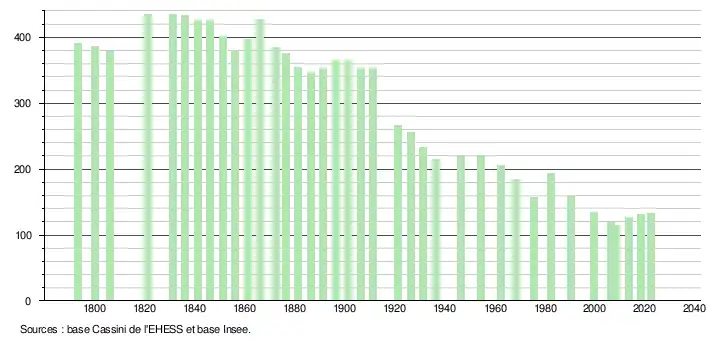 L'évolution du nombre d'habitants est connue à travers les recensements de la population effectués dans la commune depuis 1793. Pour les communes de moins de 10 000 habitants, une enquête de recensement portant sur toute la population est réalisée tous les cinq ans, les populations de référence des années intermédiaires étant quant à elles estimées par interpolation ou extrapolation[33]. Pour la commune, le premier recensement exhaustif entrant dans le cadre du nouveau dispositif a été réalisé en 2008[34].