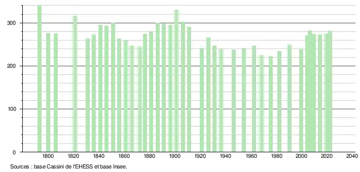 L'évolution du nombre d'habitants est connue à travers les recensements de la population effectués dans la commune depuis 1793. Pour les communes de moins de 10 000 habitants, une enquête de recensement portant sur toute la population est réalisée tous les cinq ans, les populations de référence des années intermédiaires étant quant à elles estimées par interpolation ou extrapolation[26]. Pour la commune, le premier recensement exhaustif entrant dans le cadre du nouveau dispositif a été réalisé en 2004[27].