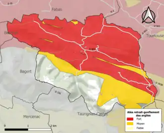 Les mouvements de terrains susceptibles de se produire sur la commune sont soit des chutes de blocs, soit des glissements de terrains, soit des effondrements liés à des cavités souterraines, soit des mouvements liés au retrait-gonflement des argiles. Près de 50 % de la superficie du département est concernée par l'aléa retrait-gonflement des argiles, dont la commune de Bédeille[39]. L'inventaire national des cavités souterraines permet par ailleurs de localiser celles situées sur la commune[40].