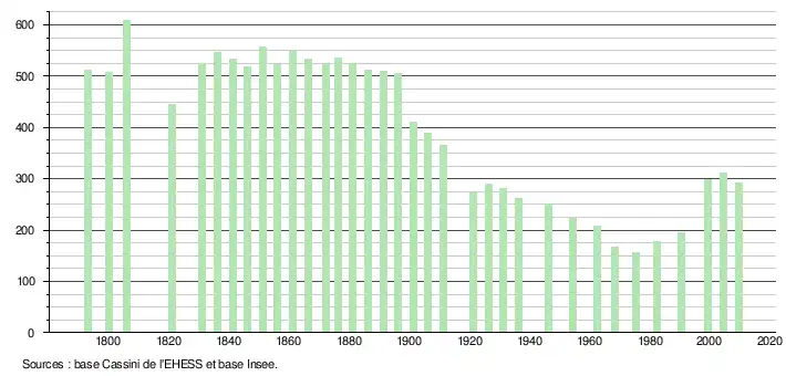 - ↑ Par convention dans Wikipédia, le principe a été retenu de n’afficher dans le tableau des recensements et le graphique, pour les populations légales postérieures à 1999, que les populations correspondant à une enquête exhaustive de recensement pour les communes de moins de 10 000 habitants, et que les populations des années 2006, 2011, 2016, etc. pour les communes de plus de 10 000 habitants, ainsi que la dernière population légale publiée par l’Insee pour l'ensemble des communes.